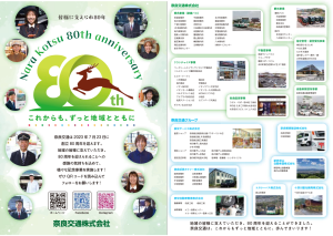 奈良自動車が吉野宇陀交通、普賢南和乗合自動車、大峯自動車、吉野自動車の4社を合併し、昭和18年7月23日、奈良交通株式会社が県下唯一のバス会社として発足しました。奈良交通80周年の歴史を振り返ります。